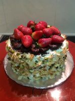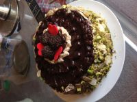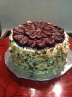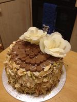 This is a beautiful moist and delicious chocolate cake with the crunch of toasted pistachios and almonds on the side topped off with rich ganache and chocolate flowers. Perfect for Christmas or any other special gathering.