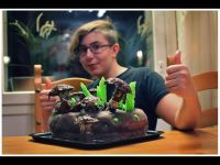 You were the reason that I started to pursue chocolate and dessert cooking and art. I’ve been following you for the past year and copying your work and finally thought to give a shot at something original. The result was fantasy mine cake, complete with glow-in-the dark crystals, your mushrooms, chocolate rocks and for the cake a banana berry cream cake.
