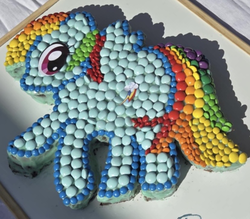 My little pony, my little pony. What is friendship all about? If you know the song, sing along and get baking because this cake will be popular in your household. It’s covered in m&m’s and only the tiniest bit of fondant for the details. And I’ve developed a brand new frosting recipe for you try.