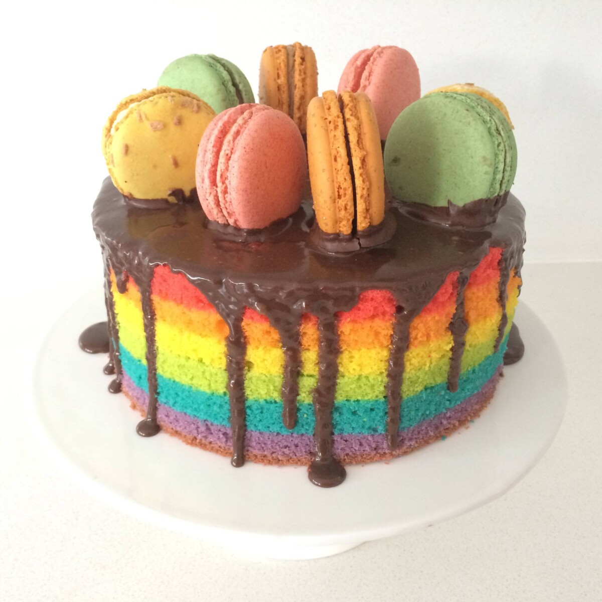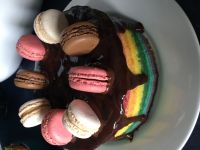 To decorate the top of the cake dip the base of some macarons in melted chocolate and add them in a circle going around the top of the cake.