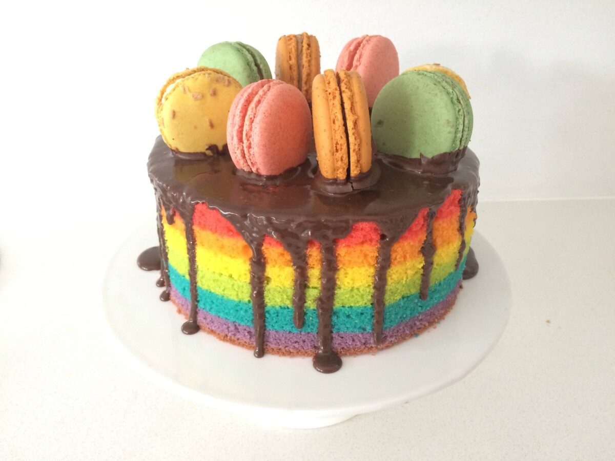 A super-easy Rainbow Steam Cake that comes out of the oven looking like this! That’s right, there’s no need to bake all those different coloured cakes separately & level layers! With this recipe, all you do is trim the edge and pour on the ganache. Really it is that simple!